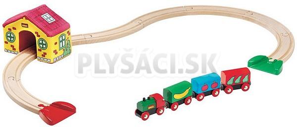 Baby vláčikodráha - Set s nádražím. Pre najmenších obsahuje domček z mäkkého materiálu, vláčik, tri vagóniky a dva výjazdy, vďaka ktorým deti môžu pokračovať v jazde aj po koberci.