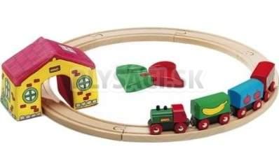 Drevená vláčikodráha s lokomotívou a nákladným autom na prepravu áut. Súčasťou sady sú aj ďalšie vagóniky, autíčka, značka, nájazd na nákladiak a závory. Táto s…
