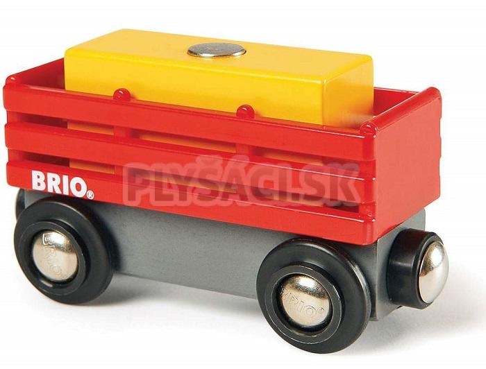 Červený vagón s žltým nákladom. Náklad je možné vyzdvihnúť magnetickým žeriavom.Skvelé rozšírenie pre vašu vláčikodráhu.Tento vagón Vám nemôže chýbať.
