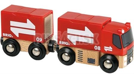 Kamión s návesom. Dokonale prevedená kombinácia plastu a dreva v kvalitnom spracovaní. Kamión má náves pripojený na magnet, preto ho môžete kombinovať s inými vagónikmi.