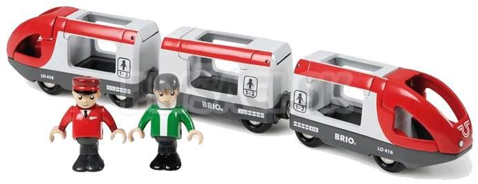 Osobný vlak s vagónikmi. Osobný vlak s vagónikmi. Moderný osobný vlak v červeno-bielej farbe. Súčasťou sú dvaja panáčikovia. Táto súprava je kompatibilná so všetkými drevenými vlačikodráhami Brio